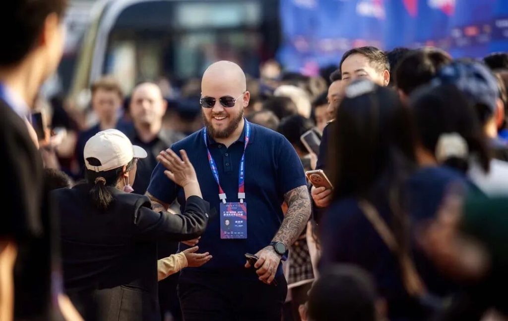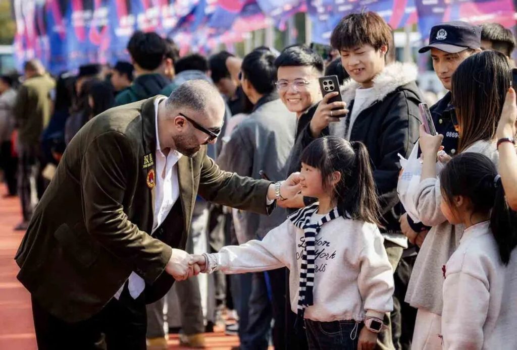 伊朗斯诺克运动员侯赛因·瓦菲在与中国小球迷互动。