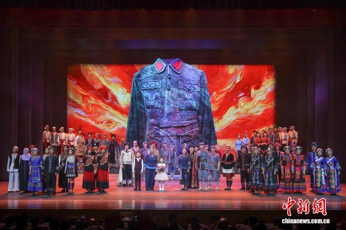 图为在江西赣州于都县,原创民族歌舞剧《五彩红军衣》末尾,全体演员出场谢幕。(资料图)刘力鑫 摄