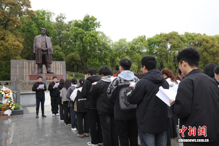 4月3日,清明节前夕,在江西省南昌市方志敏烈士纪念园,民众瞻仰烈士墓,敬献菊花,参观烈士事迹陈列室,了解方志敏的光辉事迹,深切缅怀革命先烈。图为南昌航空大学学生在方志敏烈士铜像前诵读《可爱的中国》。中新社记者 刘占昆 摄