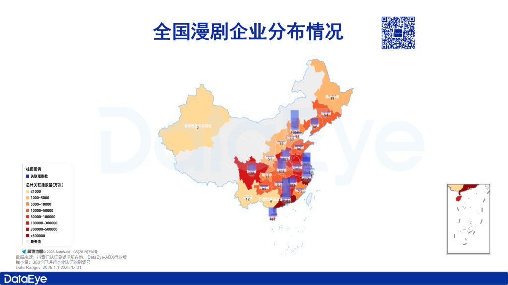 《DataEye2025年漫剧数据报告》显示,从企业分布与播放量来看,漫剧产业呈现出显著的区域集聚性,北京、江西和河南关联播放量分别达31.3亿次、25.7亿次和20.6亿次,远超部分沿海省份。