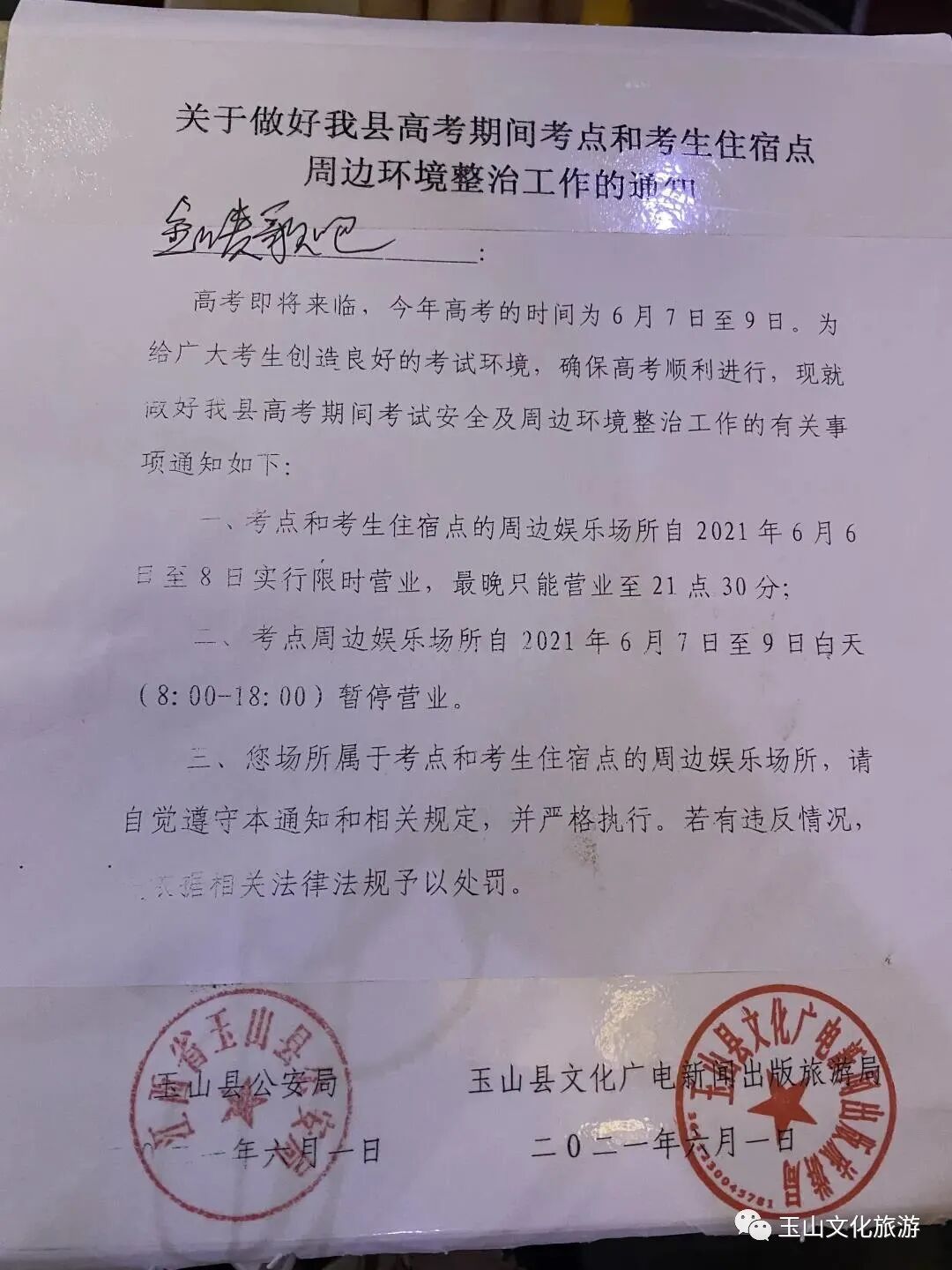 提前向考点和考生住宿点周边的娱乐场所派发《关于做好我县高考期间考点和考生住宿点周边环境整治工作的通知》,明确自6月6日至8日实行限时营业,最晚只能营业至21时30分;考点周边娱乐场所自6月7日至9日白天(8时至18时)暂停营业。