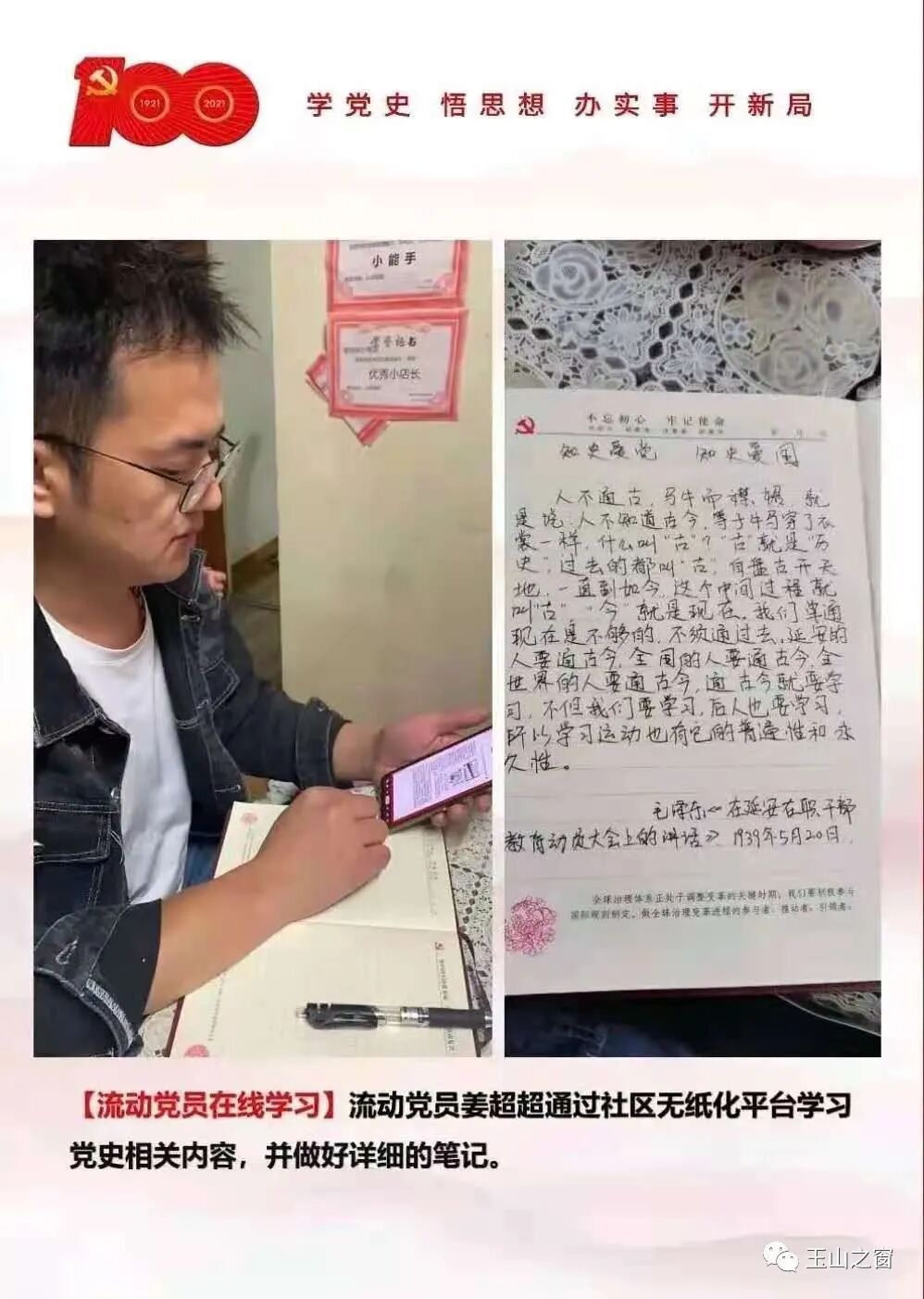 连日来,玉山县文成街道姜宅社区党支部的党员们通过手机云端看红色电影、学党史知识,通过用好“智慧”云平台,创新“云阅读”“云课堂”“云交流”方式,确保全体党员不漏学、不掉队,实现党史学习教育全覆盖。
