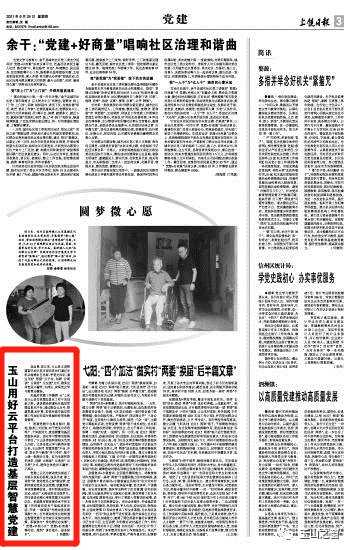 把基层党建工作搬到“云”上来是玉山县在党建信息化工作中的创新之举。玉山县建设街道社区基层党建信息化平台,通过微信公众号、智慧党建APP等,实现对城市基层党建工作动态的实时掌握和经常性教育管理。