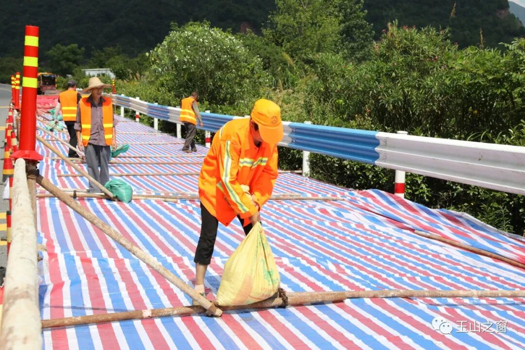 “来,把沙袋放在这边压住钢管……”7月4日,在S202白东线地质灾害点,玉山公路分局的工作人员正有序对该路段路基沉陷的地方开展抢通保畅工作:他们有的瞭望警戒、指挥车辆交替通行,有的对开裂的路面覆上塑料膜并用钢管、重物压住,防止断层进一步开裂。