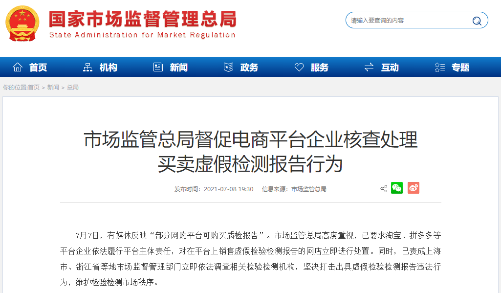 据国家市场监督管理总局消息,7月7日,有媒体反映“部分网购平台可购买质检报告”。市场监管总局高度重视,已要求淘宝、拼多多等平台企业依法履行平台主体责任,对在平台上销售虚假检验检测报告的网店立即进行处置。同时,已责成上海市、浙江省等地市场监督管理部门立即依法调查相关检验检测机构,坚决打击出具虚假检验检测报告违法行为,维护检验检测市场秩序。
