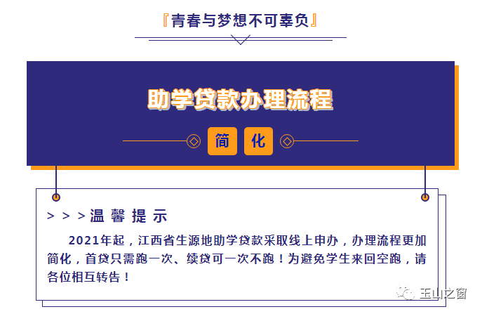 一年一度的高考录取工作即将开始,恭喜高中毕业的同学们即将迈入崭新的大学生活。正在为大学学费和生活费发愁的同学们不用愁,助学贷款 “贷”你上学,放飞梦想。玉山县学生资助管理中心正在为你解读今年的助学贷款流程!你不要错过,仔细看啦!续贷学生也要留意哟!