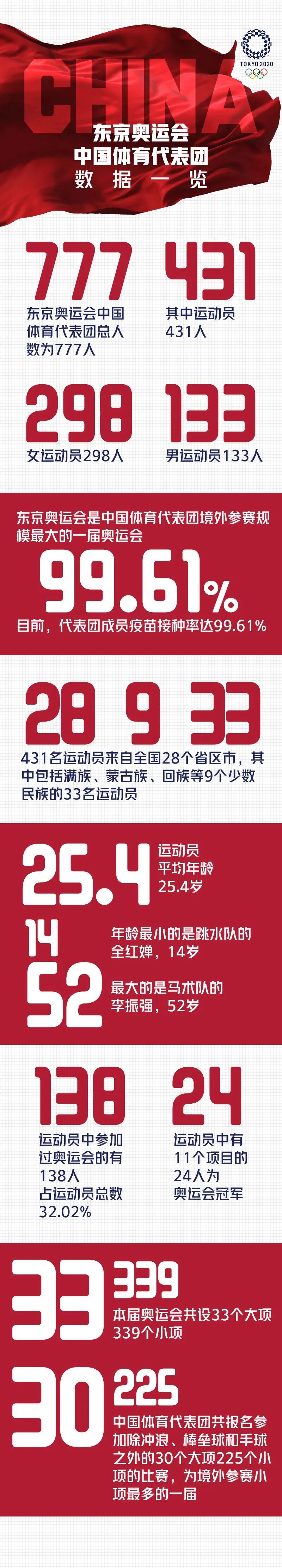7月14日,东京奥运会中国体育代表团在北京正式成立。此次中国体育代表团总人数为777人,其中运动员431人(女运动员298人、男运动员133人),教练员、领队、科医人员等运动队工作人员307人,团部工作人员39人。东京奥运会是中国体育代表团境外参赛规模最大的一届奥运会。