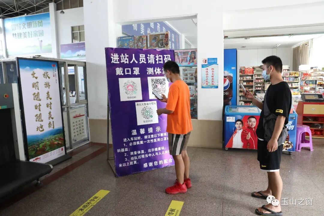 进入汽车站的旅客们自觉相隔1米,佩戴口罩,排队扫码进站。