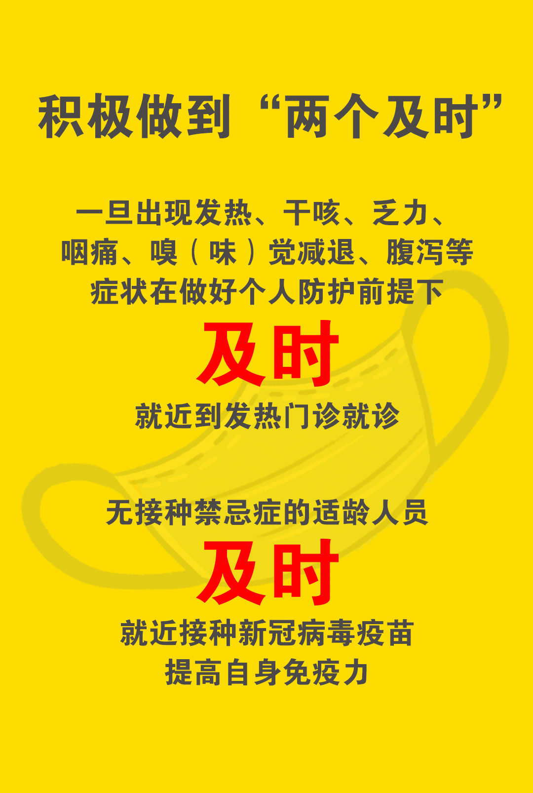 三是积极做到“两个及时”:一旦出现发热、干咳、乏力、咽痛、嗅(味)觉减退、腹泻等症状,在做好个人防护前提下,及时就近到发热门诊就诊;无接种禁忌症的适龄人员,及时就近接种新冠病毒疫苗,提高自身免疫力。