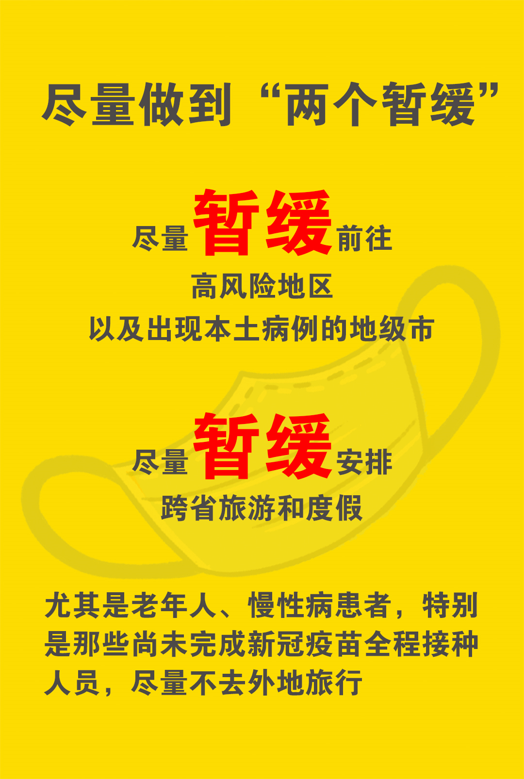 二是尽量做到“两个暂缓”:尽量暂缓前往国内中高风险地区以及出现本土病例的地级市;尽量暂缓安排跨省旅游和度假。尤其是老年人、慢性病患者,特别是那些尚未完成新冠疫苗全程接种人员,尽量不去外地旅行。