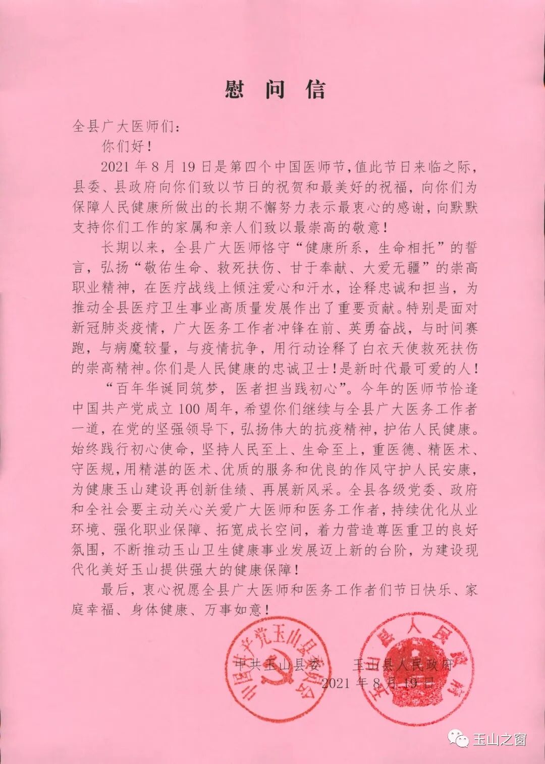 “百年华诞同筑梦,医者担当践初心”。今年的医师节恰逢中国共产党成立100周年,希望你们继续与全县广大医务工作者一道,在党的坚强领导下,弘扬伟大的抗疫精神,护佑人民健康。始终践行初心使命,坚持人民至上、生命至上,重医德、精医术、守医规,用精湛的医术、优质的服务和优良的作风守护人民安康,为健康玉山建设再创新佳绩、再展新风采。全县各级党委、政府和全社会要主动关心关爱广大医师和医务工作者,持续优化从业环境、强化职业保障、拓宽成长空间,着力营造尊医重卫的良好氛围,不断推动玉山卫生健康事业发展迈上新的台阶,为建设现代化美好玉山提供强大的健康保障!
