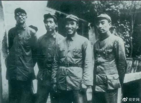 1937年8月22日至25日,中共中央在洛川冯家村举行政治局扩大会议(即洛川会议)。图为毛泽东和朱德、周恩来、林伯渠的合影。