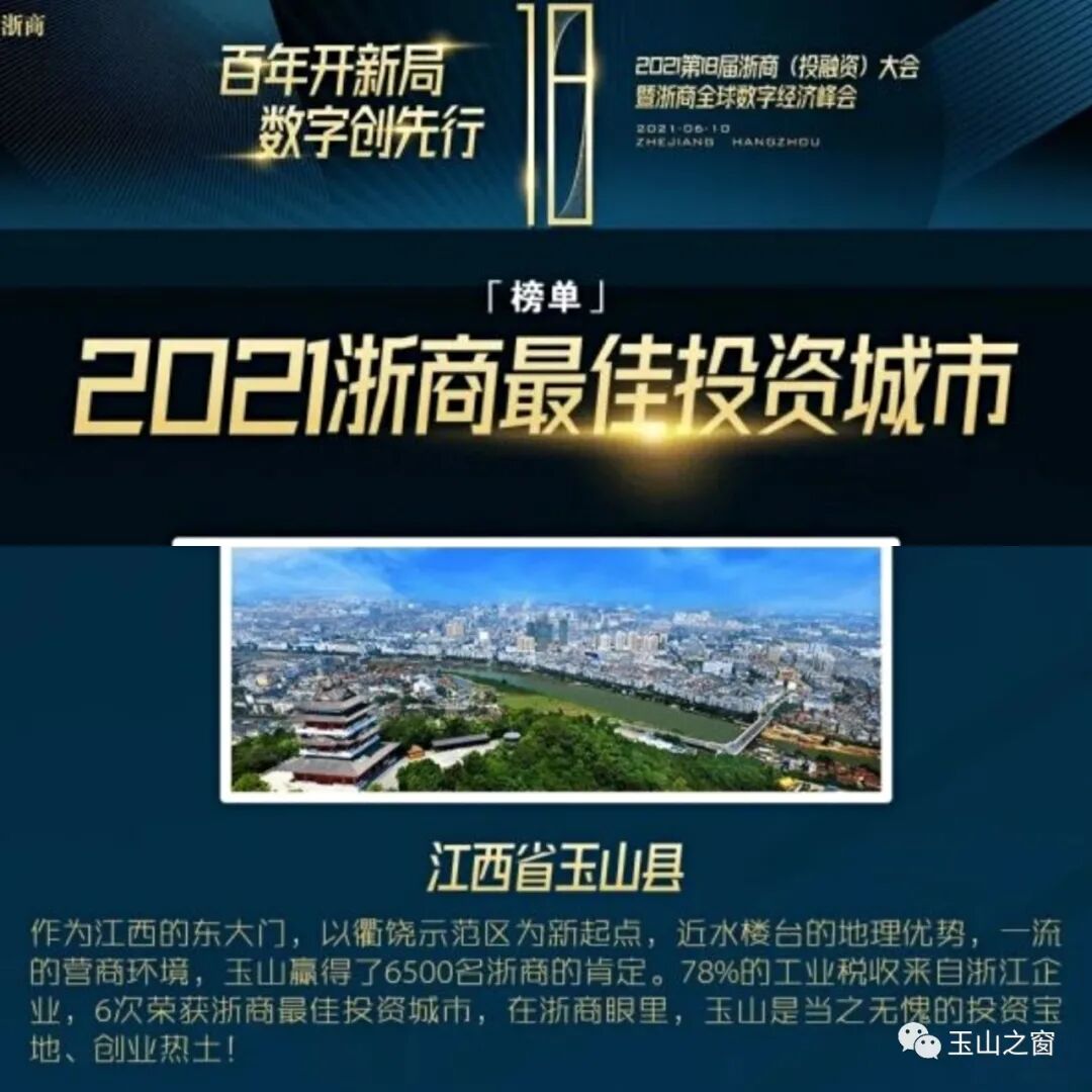 6月10日,在浙江杭州召开的第18届浙商(投融资)大会上,玉山县被评为2021年度“浙商最佳投资城市”,再度获评,玉山成为六次获此殊荣的城市。