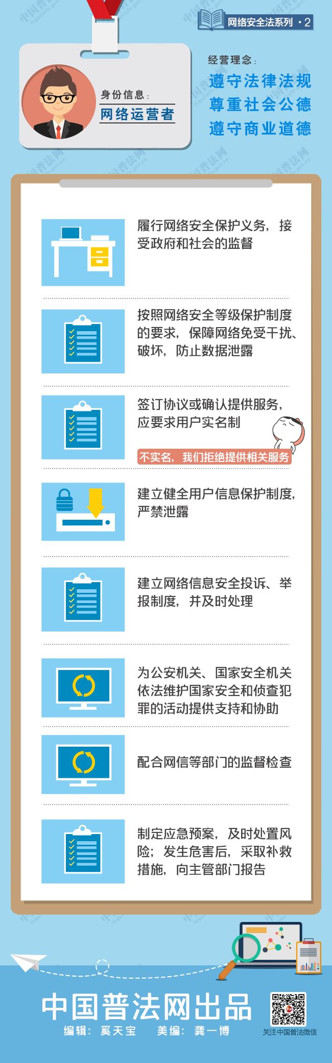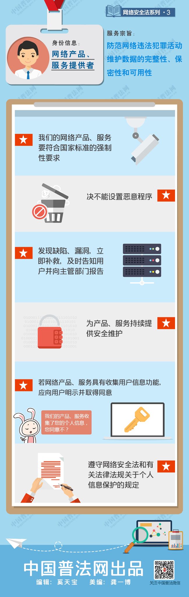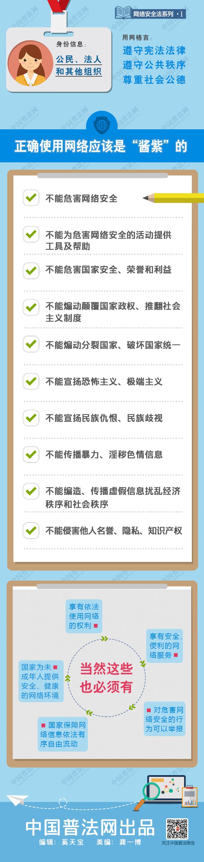 网络安全宣传周丨图解《网络安全法》 2021年10月15日 17:00 阅读(1645) 《中华人民共和国网络安全法》(以下简称《网络安全法》)是我国第一部全面规范网络空间安全管理方面问题的基础性法律,是我国网络空间法治建设的重要里程碑,是依法治网、化解网络风险的法律重器,是让互联网在法治轨道上健康运行的重要保障。 《网络安全法》是为保障网络安全,维护网络空间主权和国家安全、社会公共利益,保护公民、法人和其他组织的合法权益,促进经济社会信息化健康发展制定。明确了部门、企业、社会组织和个人的权利、义务和责任,规定了国家网络安全工作的基本原则、主要任务和重大指导思想、理念。将成熟的政策规定和措施上升为法律,为政府部门的工作提供了法律依据,体现了依法行政、依法治国要求。 让我们一起走进今天的网信课堂,帮你一图看懂《网络安全法》。 来源:中国普法网 本文来自网络,不代表中国博士县—玉山之窗立场。转载请注明出处: https://www.yszc.com.cn/32707.html