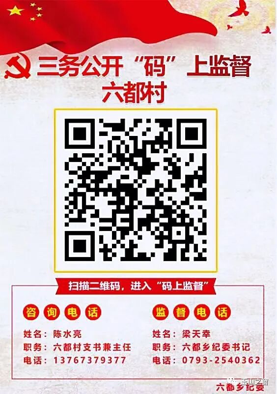 “大家可以用微信扫描二维码,一起了解和监督村级党务、村务、财务情况。”近日,六都乡纪检干部正在送“码”上户,将印有村级“三务”公开二维码、咨询电话、监督电话的卡片张贴到六都村居民家门口。
