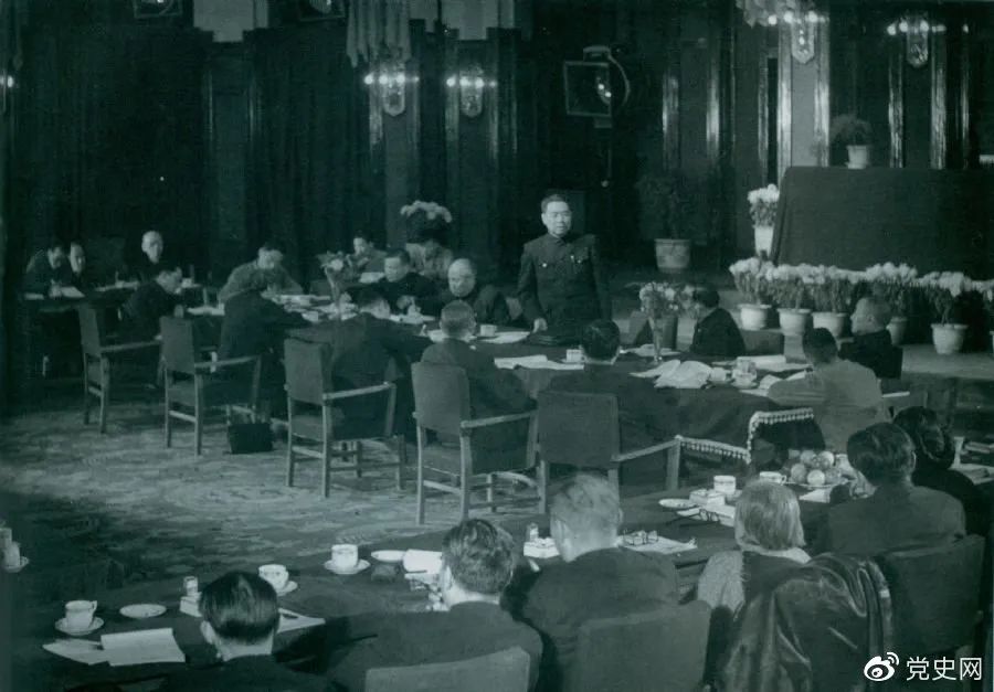 1949年10月21日,周恩来主持召开中央人民政府政务院第一次会议。正面左起:陈云、董必武、周恩来、郭沫若、黄炎培。