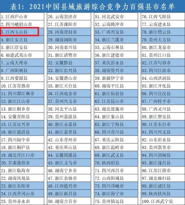 11月2日,竞争力智库、中国经济导报社和北京中新城市规划设计研究院等机构在北京联合发布《中国县域旅游竞争力报告2021》。玉山县以“2021中国县域旅游综合竞争力百强县市”第三的成绩脱颖而出,再次擦亮旅游强县品牌。