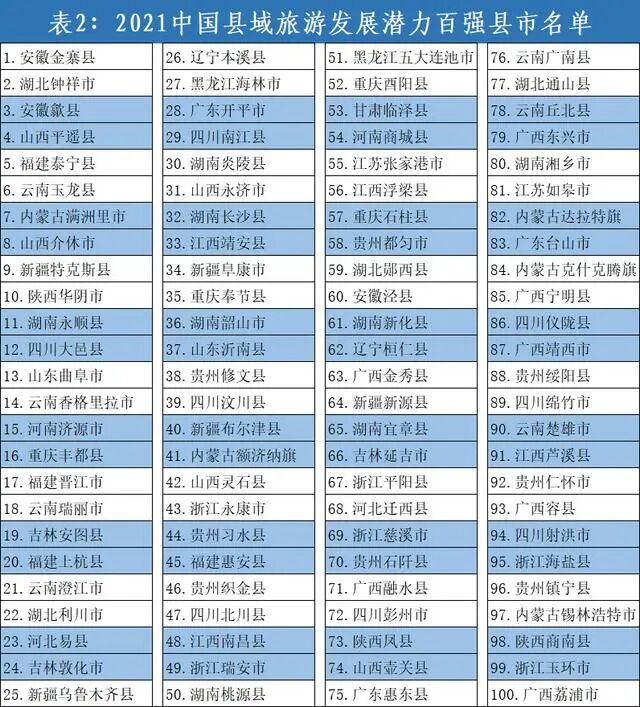 据悉,中国县域旅游竞争力评价对象为全国(不含港澳台地区)1871个县域(不含县级市辖区)。中国县域旅游竞争力评价体系包含中国县域旅游综合竞争力评价体系和中国县域旅游发展潜力评价体系。其中,中国县域旅游综合竞争力评价主要考察县域旅游资源富集度、旅游经济活跃度、旅游设施完善度、生态环境优势度、政府推动实效度、旅游品牌美誉度等六个方面,六个分项指数集合成竞争力指数,竞争力指数前100名即为中国旅游百强县市;中国县域旅游发展潜力评价主要考察县域资源开发潜力、市场扩张潜力、基础支撑潜力、政府推动潜力等四个方面,四个分项指数集合成发展潜力指数,发展潜力指数前100名即为中国旅游潜力百强县市。
