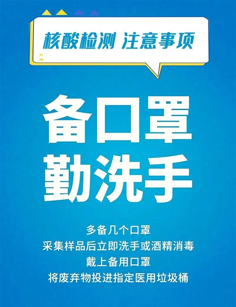 特别提醒:健康码黄码人员需前往指定的核酸采样点。经过社区防控工作人员同意后,洗净手,戴好医用外科口罩,不使用公共交通工具前往检测。