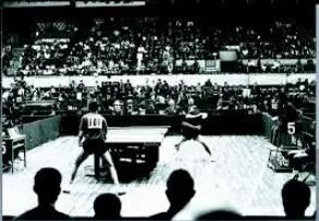 中国乒乓球协会和美国乒乓球协会联合组队,参加于此地开始的世乒赛混合双打比赛。