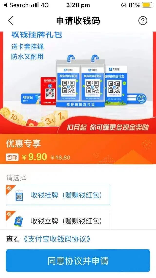 以支付宝为例,在收付款功能中,记者根据提示申请了个人收钱码,这一收钱码即为上述通知中提及的个人静态收款码。支付宝页面显示,该产品物料费用9.9元,分为收钱挂牌以及收钱立牌两种,在填好具体收货地址后,支付宝会邮寄一份收钱挂牌礼包,包括卡套挂绳等,这也是很多街边小贩普遍使用的收款物料,较为常见。