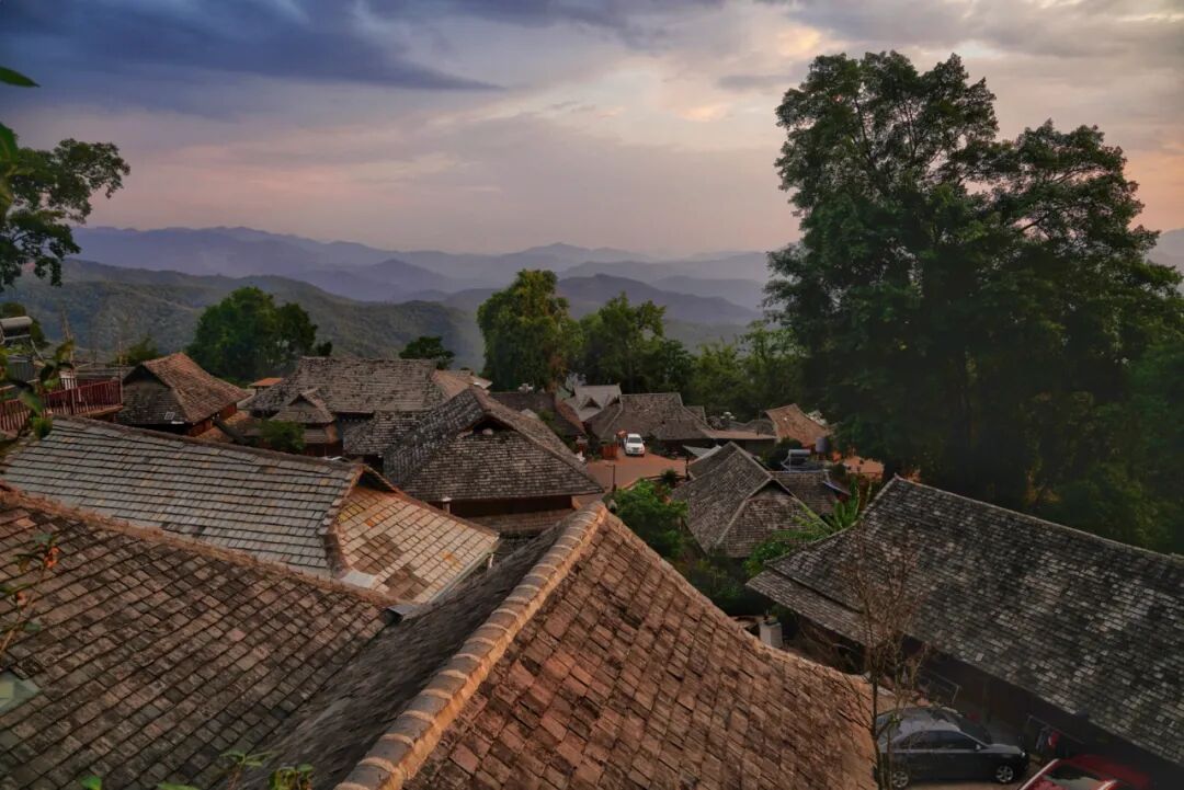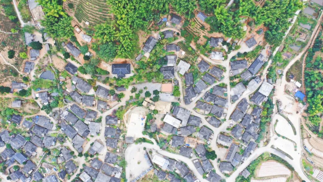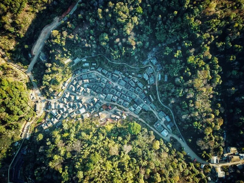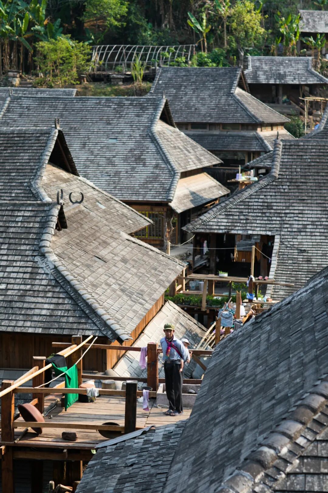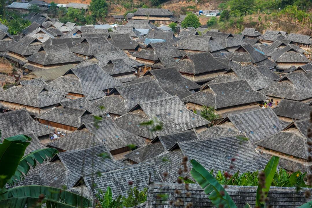 古旧的杆栏瓦房,连片的古寨映入眼帘,屋顶陡峭的坡面上覆盖着黑色的挂瓦。