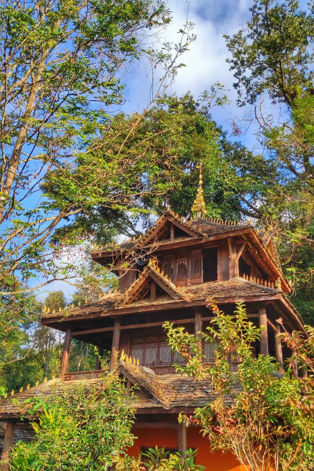 登上观景台,清灰色傣族传统民居尽收眼底,四周有古树的陪伴,北边还有一座缅寺庇佑,这座寺庙也是电影中经典动图的出处。