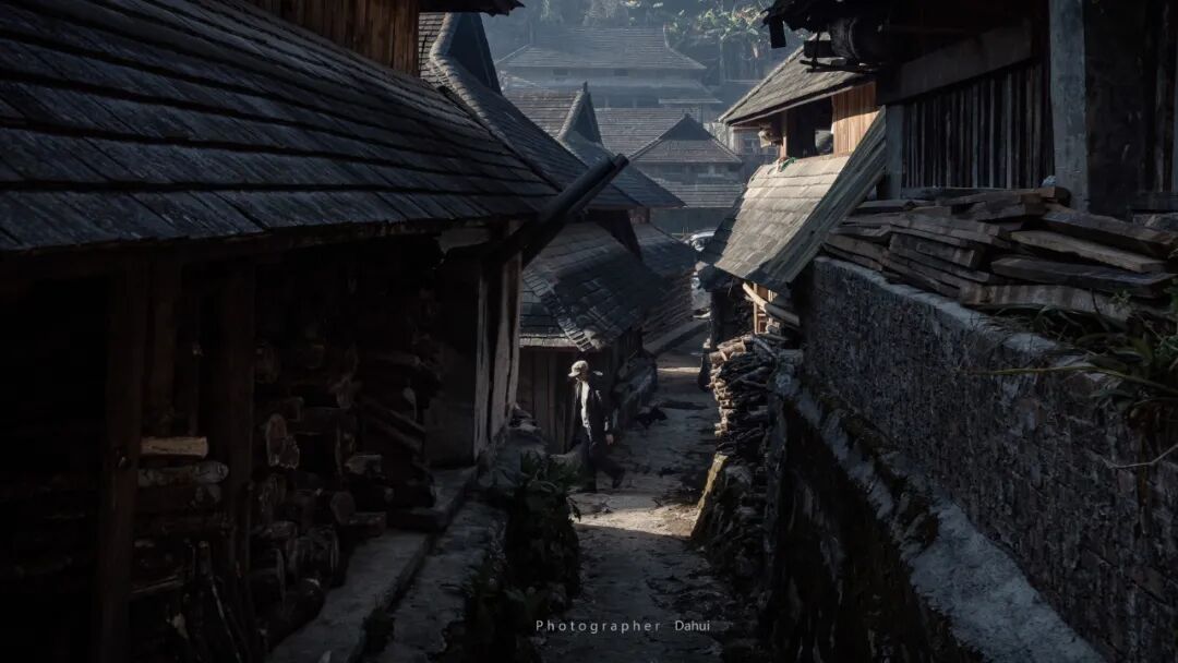 进寨后的古寺旁有一株3000年的巨柏,村寨古朴静谧,黛瓦屋顶上装饰着三片茶叶状的图腾。