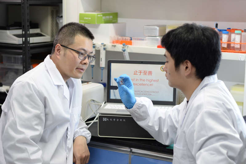 图为东南大学生物电子学国家重点实验室刘宏教授(左)与学生观察DNA存储电极。图源:东南大学
