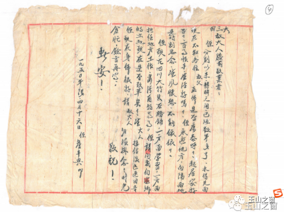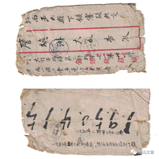 信封使用应是部队自制信封,部队仍驻扎川东大竹县石桥铺,番号依然是第二野战军第十一军第三十一师第九十一团二营五连。时间为1950年4月16日(与前封信系接连两天写了信)。主要内容是表达与家人相隔两地思念甚苦,望风怀想,不能依依!告知家人担任地方工作和肃清匪特任务,询问家乡土改工作进展如何。