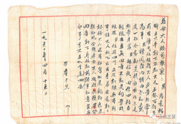 男离家转瞬五六年,刻下不知大人玉体可好否?前在清弋江接得大人玉音非常高兴。男读阅信内情由已知家庭一切合家都是很好。秋收已是非常丰富。男接信后,回信四封自到现在并无回音,不知是何原(缘)故。现在男住在四川,正在训练。无有别事,请大人放心。还有吾弟在家好?祀俸大人还有叔等,以是钧好,这是很好的。今后希望大人接信以后,早发回音。刻下身体如前,诸事如意,並无他事。言不多叙千急回音。