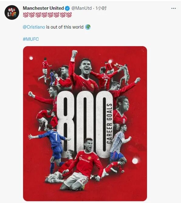 赛后,曼联官方晒出C罗800球海报,并配文:“C罗不属于这个世界。”