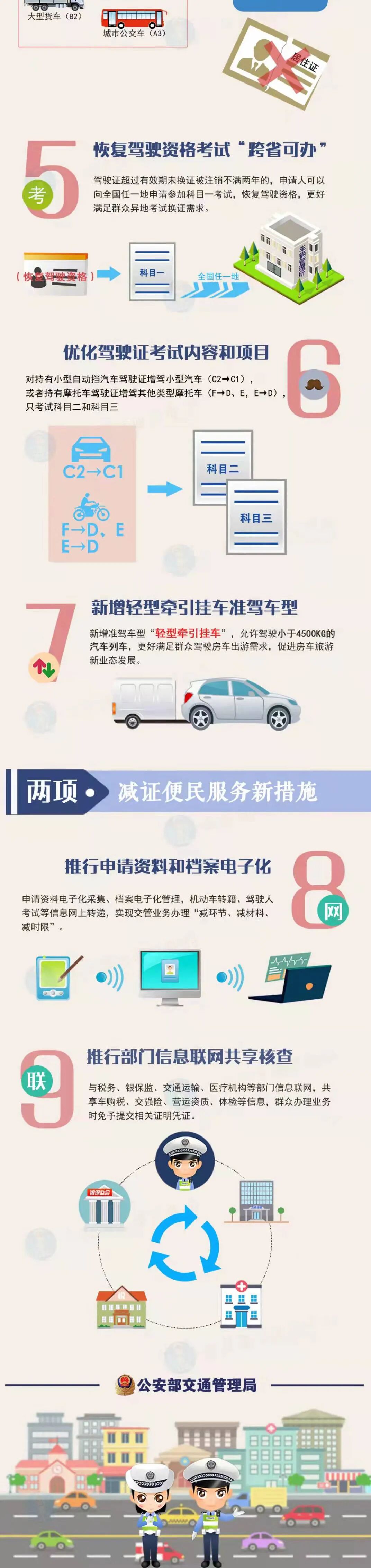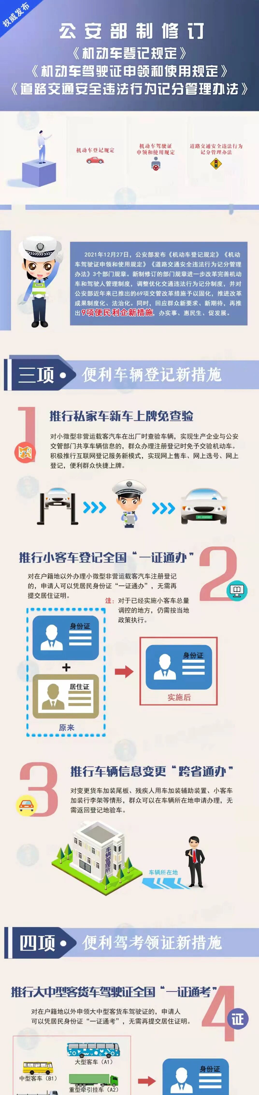 重大调整!玉山的驾驶人请注意! 2022年1月5日 9:31 阅读(3556) 玉山的驾驶人请注意! 记分规则有重大调整! 日前举行的公安部新闻发布会上 公安部交管局局长李江平介绍 公安部完善道路交通违法记分管理制度—— 《道路交通安全违法行为记分管理办法》 2022年4月1日起实施 该办法共7章37条 包括记分分值、记分执行、满分处理、 记分减免、法律责任等内容 修订主要围绕优化记分管理制度 调整记分项目和分值 在保持对严重交通违法行为 管理力度的前提下 降低了部分交通违法行为记分分值 删除了一些交通违法行为记分 同时 增加了减免记分规定 促进记分管理与教育引导相结合 坚持公开透明、程序正当、严格监督 明确对弄虚作假、买分卖分等行为 严格责任追究 此外,公安部在北京召开新闻发布会, 公安部再推出9项交管便民利企新措施: ①推行私家车新车上牌免查验; ②推行小客车登记全国“一证通办”; ③推行车辆信息变更“跨省通办”; ④推行大中型客货车驾驶证全国“一证通考”; ⑤恢复驾驶资格考试跨省可办; ⑥优化驾驶证考试内容和项目; ⑦新增轻型牵引挂车准驾车型; ⑧推行申请资料和档案电子化; ⑨推行部门信息联网共享核查。 来源:江西日报 本文来自网络,不代表中国博士县—玉山之窗立场。转载请注明出处: https://www.yszc.com.cn/40774.html