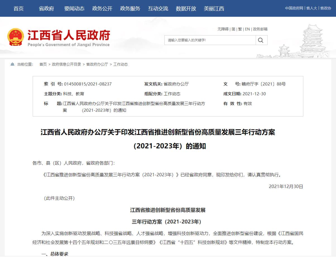 为深入实施创新驱动发展战略、科技强省战略、人才强省战略,增强科技创新驱动力,全面推进创新型省份建设,近日,《江西省推进创新型省份高质量发展三年行动方案(2021-2023年)》印发。方案共提出了七个方面共计20条重点任务,同时在保障措施方面,方案要求加强组织领导、加大科技投入、完善科技治理、深化开放合作和强化环境营造。 江西自创区内高新技术产业增加值占规模以上工业增加值比重达到62%。 优化“一核十城多链”空间布局,打造以大南昌都市圈为核心的中部地区科技创新中心。 力争省级创新型县(市、区)达25个左右。 基本科学指标数据库(ESI)前1%学科保持稳步增长。 力争建设1-2个国家重大科技基础设施。 新组建创新联合体或科技协同创新体20个、国家级科技创新平台10个,引进共建一批高端研发机构和2-3家具有国内国际影响力的重大研发机构。 实施重大科技专项30个左右。 实施“揭榜挂帅”项目50个左右,建立健全全省重大科技项目联席会议制度。 国有控股上市公司达到30家以上,江铜集团建成具有全球竞争力的世界一流企业,培育5家以上中国500强企业。 新培育独角兽企业(含潜在、种子)12家、瞪羚企业(含潜在)140家、入国家库科技型中小企业10000家、国家技术创新示范企业15家、“专精特新”企业1500家、“小巨人”企业50家。 力争全省规模以上工业企业建有研发机构比例达40%以上。 引进高水平创新团队及科技创新领军人才200名,外国专家600名。 新增本土院士2-3名,省级以上领军人才400名。 研究出台科技成果评价指导意见和社会力量设立科学技术奖规范。 力争创建国家高新技术产业开发区、国家农高区、国家农业科技园区、国家大学科技园各1-2家。 力争新增产业创新服务综合体10家,科技特派员“千百万”帮扶行动实现全省开发区全覆盖。 力争新增国家创新型产业集群、国家高新技术产业化基地各1-2个。 技术合同成交额每年保持10%左右增幅。 新增科技企业孵化器、众创空间各10家。 新增上市科技型企业3家以上,力争“科贷通”累计放款达到80亿元。 扫描或识别二维码,查看文件内容