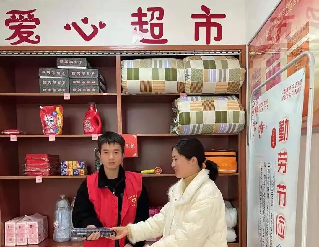 现场的积分兑换区以“明码标价”的方式摆放着种类多样的可兑换物品,志愿者拿着自己的积分存折,兑换自己需要的礼品,现场一片欢声笑语。