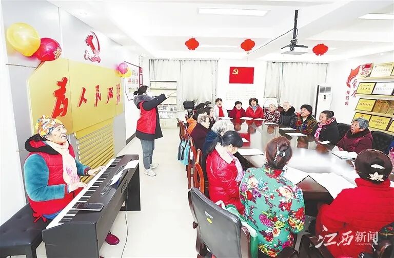 ▲1月28日,南昌市东湖区光明社区邻里中心,老人们聚在一起排练合唱歌曲。摄影 | 江西日报记者 吴文兵