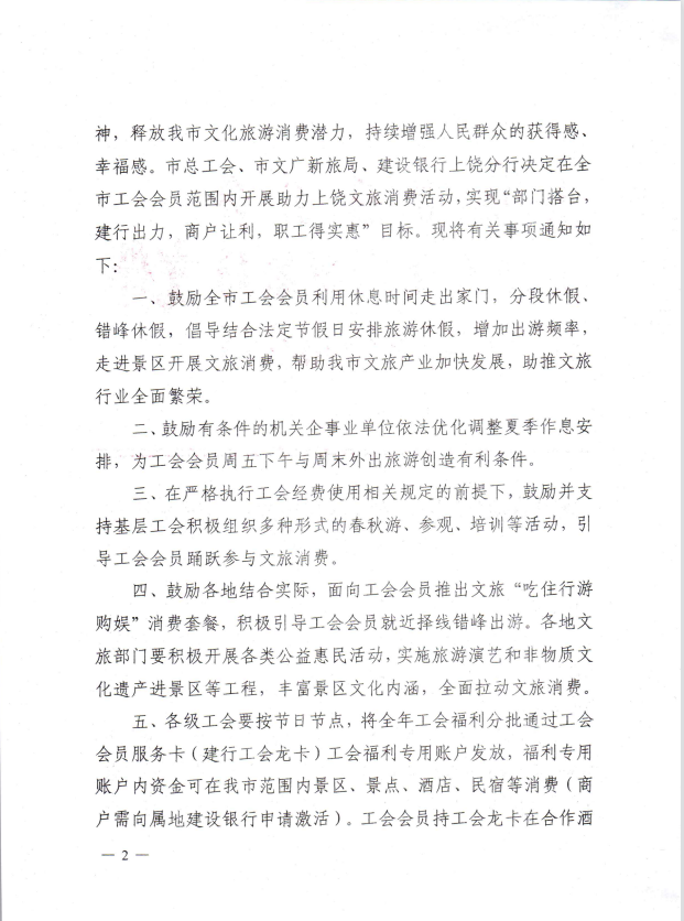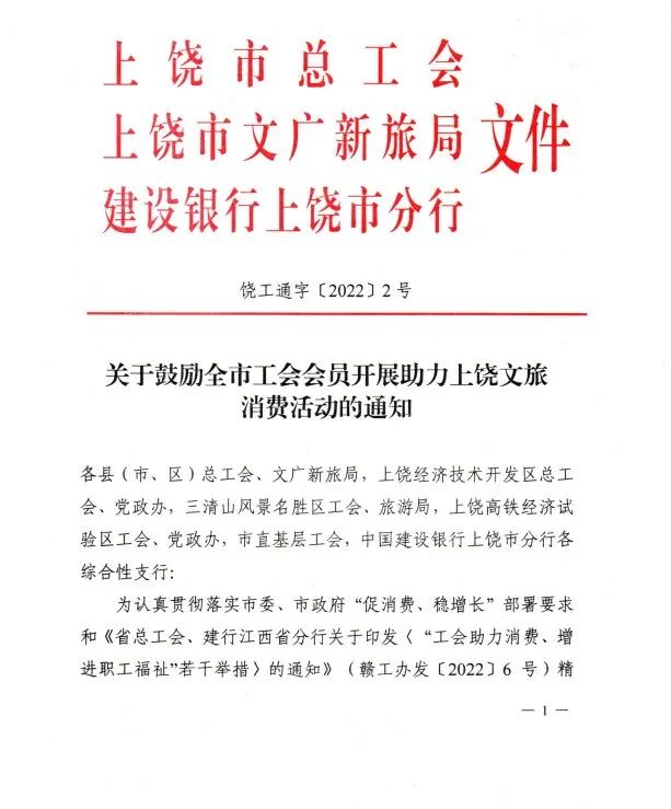 为认真贯彻落实市委、市政府“促消费、稳增长”部署要求和《省总工会、建行江西省分行关于印发〈“工会助力消费、增进职工福祉”若干举措〉的通知》(赣工办发〔2022〕6号)精神,释放我市文化旅游消费潜力,持续增强人民群众的获得感、幸福感。市总工会、市文广新旅局、建设银行上饶分行决定在全市工会会员范围内开展助力上饶文旅消费活动,实现“部门搭台,建行出力,商户让利,职工得实惠”目标。现将有关事项通知如下: