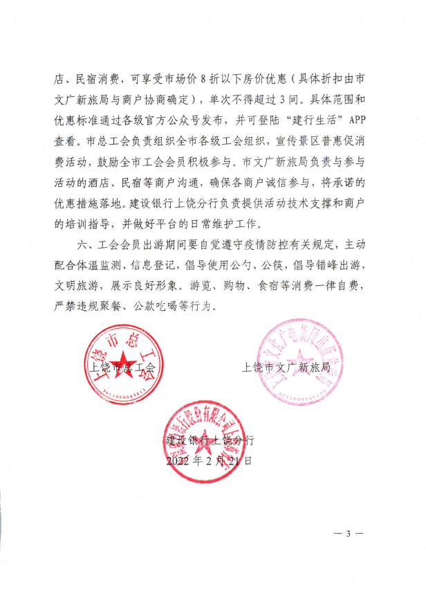 五、各级工会要按节日节点,将全年工会福利分批通过工会会员服务卡(建行工会龙卡)工会福利专用账户发放,福利专用账户内资金可在我市范围内景区、景点、酒店、民宿等消费(商户需向属地建设银行申请激活)。工会会员持工会龙卡在合作酒店、民宿消费,可享受市场价8折以下房价优惠(具体折扣由市文广新旅局与商户协商确定),单次不得超过3间。具体范围和优惠标准通过各级官方公众号发布,并可登陆“建行生活”APP查看。市总工会负责组织全市各级工会组织,宣传景区普惠促消费活动,鼓励全市工会会员积极参与。市文广新旅局负责与参与活动的酒店、民宿等商户沟通,确保各商户诚信参与,将承诺的优惠措施落地。建设银行上饶分行负责提供活动技术支撑和商户的培训指导,并做好平台的日常维护工作。