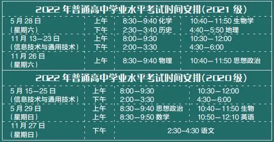 2022年我省高中学业水平考试合格性考试的报名时间为上半年3月1日至3月31日(不含法定休息日),下半年9月13日至9月30日(不含法定休息日),逾期不予办理。具体考试时间详见表格。