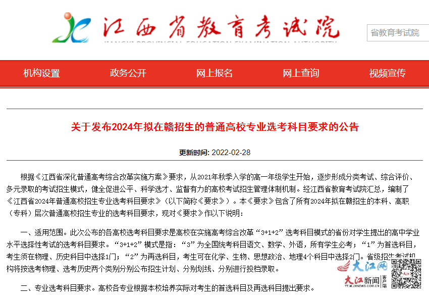 《关于发布2024年拟在赣招生的普通高校专业选考科目要求的公告》