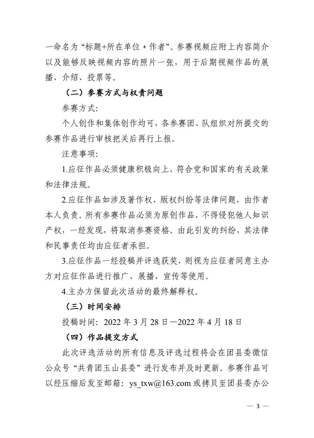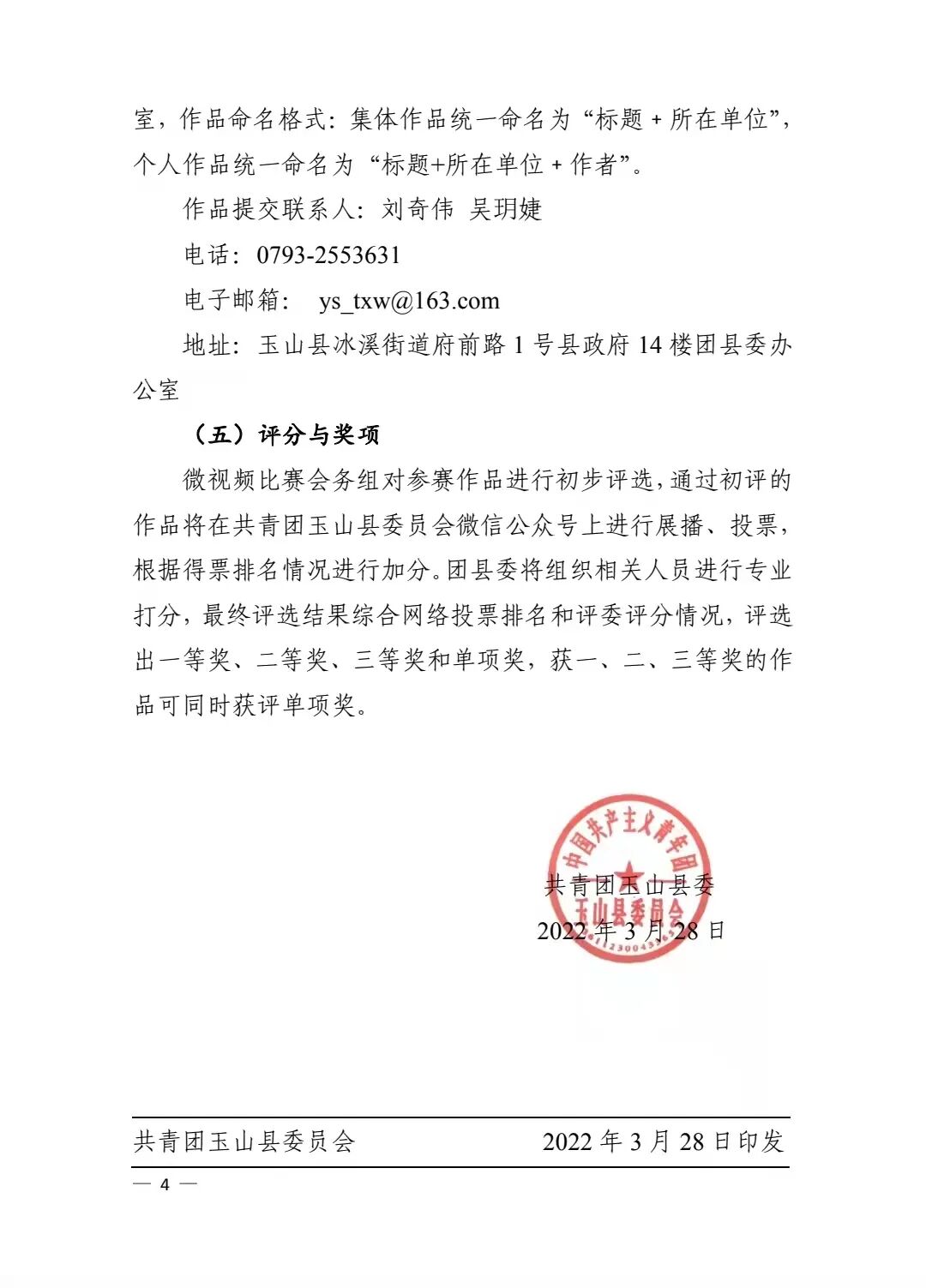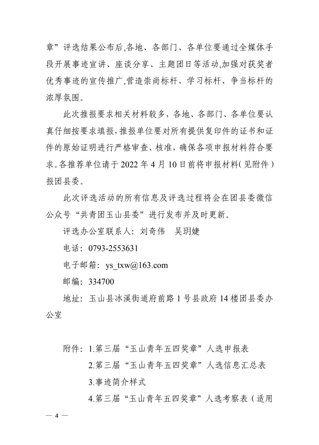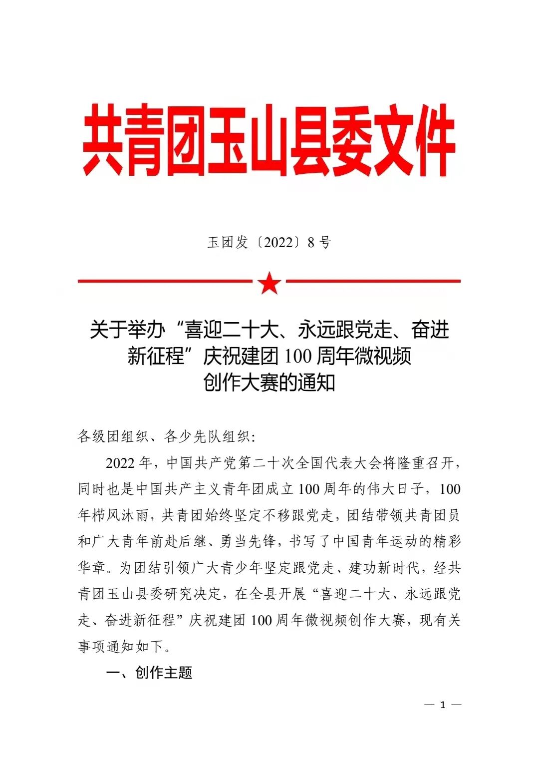 在建团百年之际,为充分发挥青年典型模范带头作用,团结引领广大团员青年踔厉奋发、砥砺笃行,以优异成绩喜迎党的二十大胜利召开,经共青团玉山县委研究决定开展第三届“玉山青年五四奖章”评选工作、“两红两优”评选、庆祝建团100周年微视频创作大赛等活动。