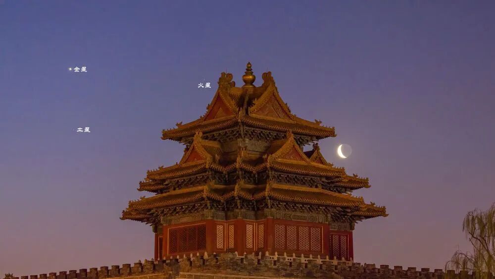这是北京市天文爱好者吴鲁萍2022年3月28日清晨在北京拍制的金星、火星、土星与残月。(本人供图)