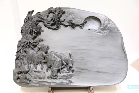 在玉山馆内,罗纹砚雕刻大师童飞正在全神贯注地雕琢一方名为《荷塘清趣》的砚台,人声鼎沸的展会环境并没有让童师傅分心,见到有游客询问他总是先将刻刀放下,随后再认真地答复。“做雕刻的要守心,像这方约有半米长的《荷塘清趣》砚的工期就长达一个多月,从选料到打磨都需要费心思。”童师傅细致耐心地介绍。
