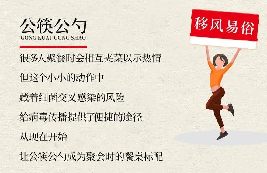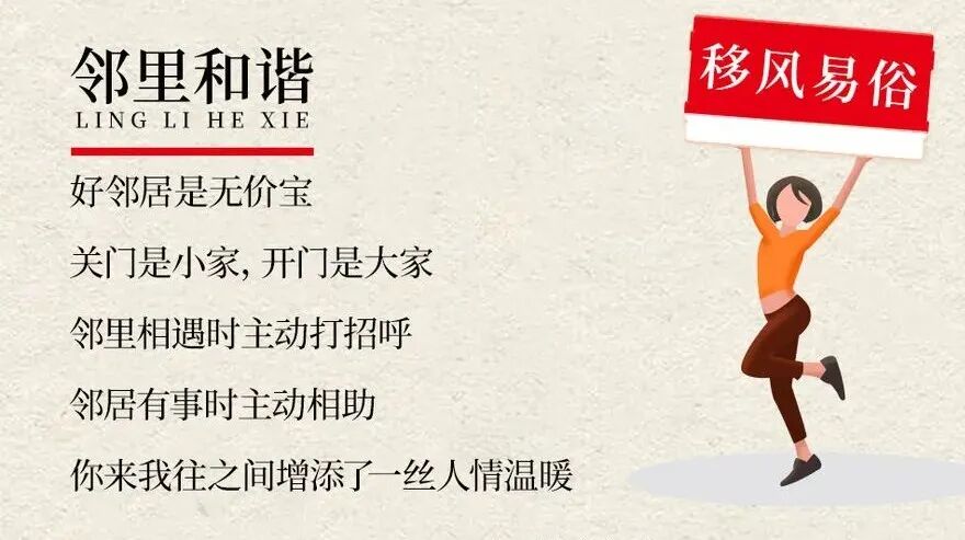 喜事新办“刷”新风 丧事简办“俭”示范 文明祭祀“全”覆盖 崇尚科学“反”迷信 低碳生活“领”风尚 注重家风“传”美德 公筷公勺“助”健康 邻里和谐“多”帮忙 社会文明需要我们共同创造 在潜移默化中改变不合时宜的旧习俗 在润物无声中植入民淳俗厚的新风尚 让文明健康新理念 化入人心、融入我们的生活!