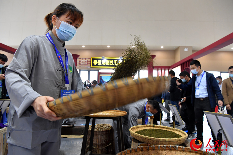 在樟树岐黄小镇里,药工正在进行樟帮中药炮制技艺展演。人民网记者 时雨摄
