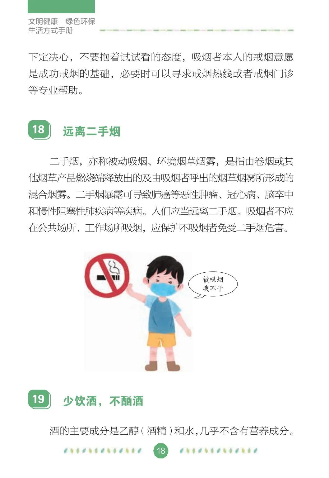 今年4月是第33个爱国卫生月。在全国爱卫办、中央文明办、健康中国行动推进办的指导下,中国健康教育中心组织专家编写了《文明健康 绿色环保生活方式手册》,分别从讲文明、铸健康、守绿色、重环保4个角度,向公众介绍如何在日常生活、工作和学习中积极践行文明健康、绿色环保的生活方式,切实增强公众的节约意识、环保意识和生态意识,维护自己和家人的健康,实现可持续发展。