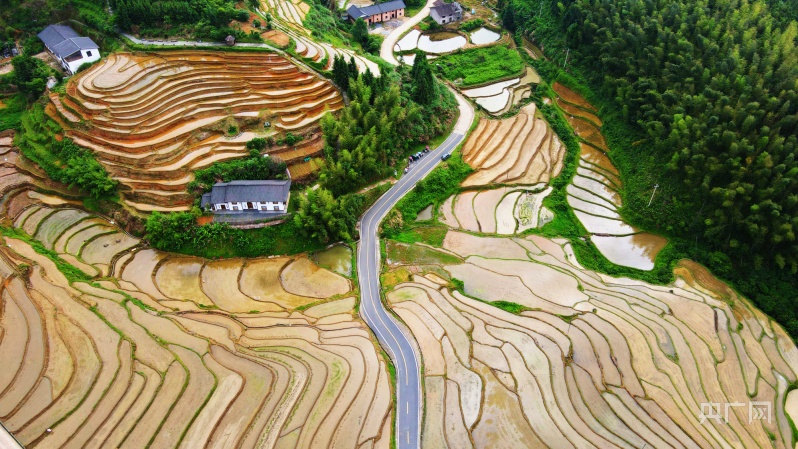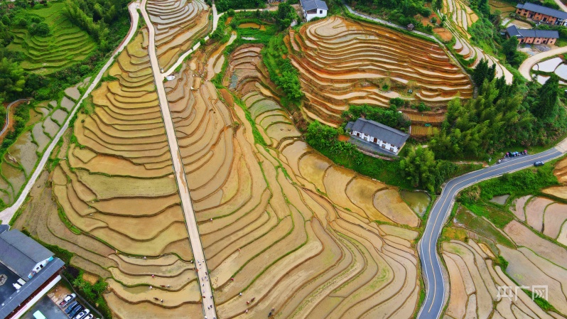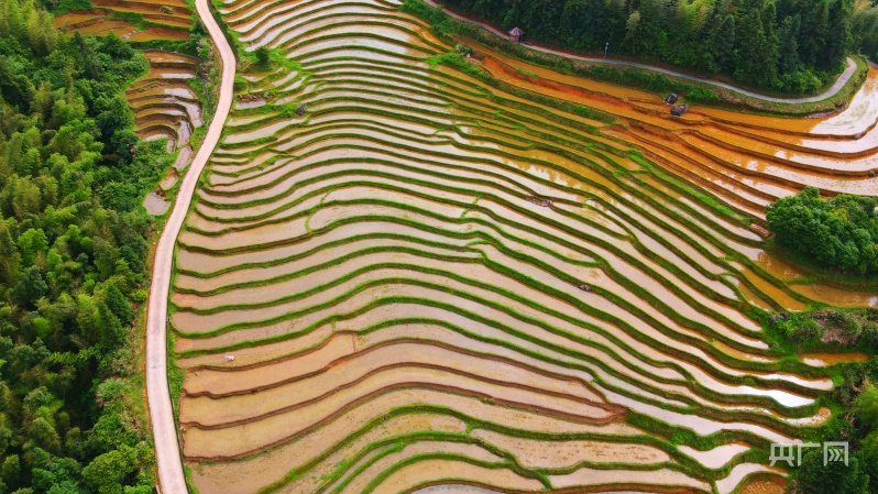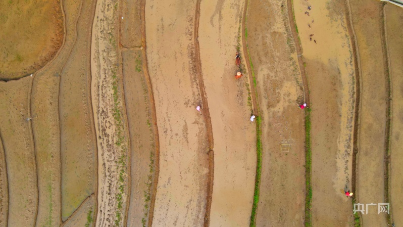 央广网赣州5月31日消息(记者胡斐)5月30日,无人机俯瞰下的江西崇义上堡梯田,田间水如明镜,万亩梯田由低到高,堆叠如云梯,田间地头农户忙碌的身影、散落的民居,构成一幅人与自然的和谐画卷。