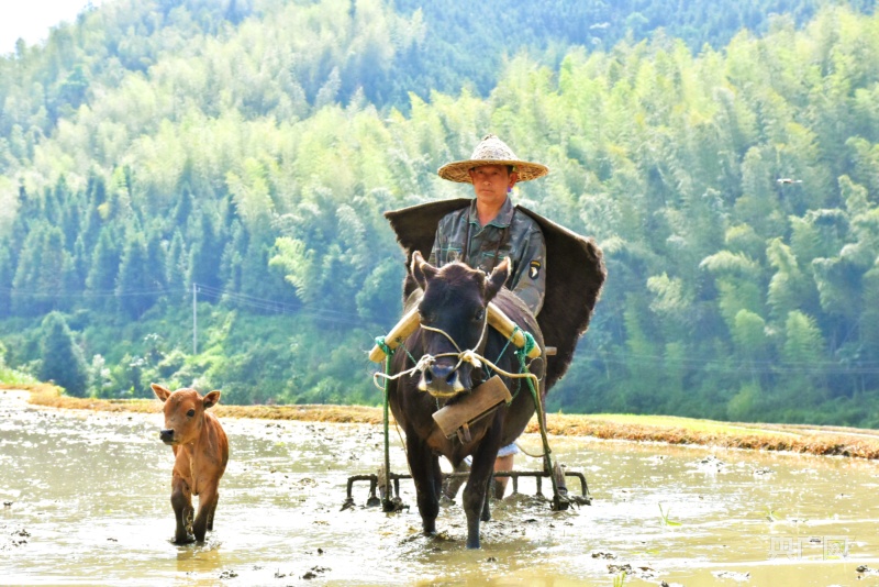 层层叠叠的梯田,山泉水顺流而下,在一块块田里延宕开来。农户们头戴斗笠,身穿蓑衣,赶牛扶犁,来回翻耕,在身后留下一道道水波,村里妇女们忙着打田坎。“我们上堡梯田水稻种植面积4600亩左右,端午节后,这些田块就要悉数插满秧苗,等待十月的大丰收。”崇义县上堡乡水南村村干部沈伦民告诉记者。