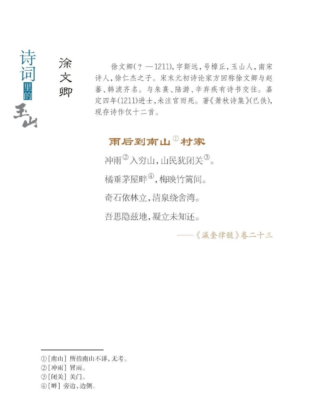 【我爱玉山】诗词《雨后到南山村家》|《玉山村民斫石为砚,仲至以诗来索,次韵》 2024年6月13日 17:29 阅读(2876) 来源于政协玉山县文史资料编纂委员会编纂的《诗词里的玉山》一书。 来源: 玉山文化旅游 本文来自网络,不代表中国博士县—玉山之窗立场。转载请注明出处: https://www.yszc.com.cn/99090.html