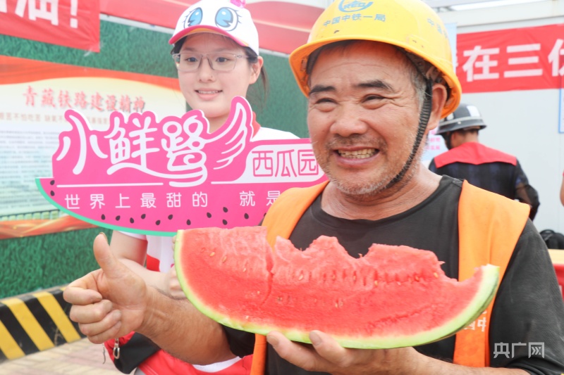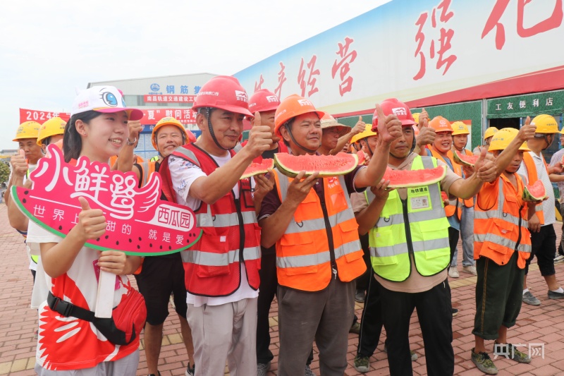 “大哥累大姐忙,凉凉的西瓜请您尝!”伴随着志愿者的亲切呼唤,一块块鲜红甘甜的西瓜被仔细切好递到了工人们的手中,工人们的脸上露出了喜悦和感动的笑容。大家笑着聚在一起,享受着这难得的清凉时光。